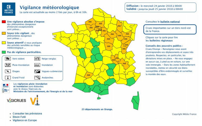 Météo France maintient 23 départements en vigilance orange, mercredi 24 janvier