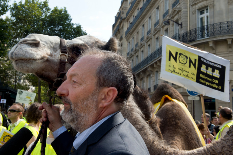 Le maire de Janvry, Christian Schoettl, défilant avec des camélidés dans Paris en 2014 lors d'une manifestation contre la réforme des rythmes scolaires.