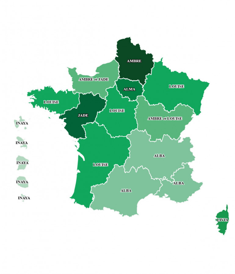 Du côté des filles : Louise, Jade et Ambre sont les trois prénoms qui ont été les plus donnés. Louise garde sa première place, Jade gagne deux places puisqu'elle était 4e l'année précédente et Ambre perd une place.