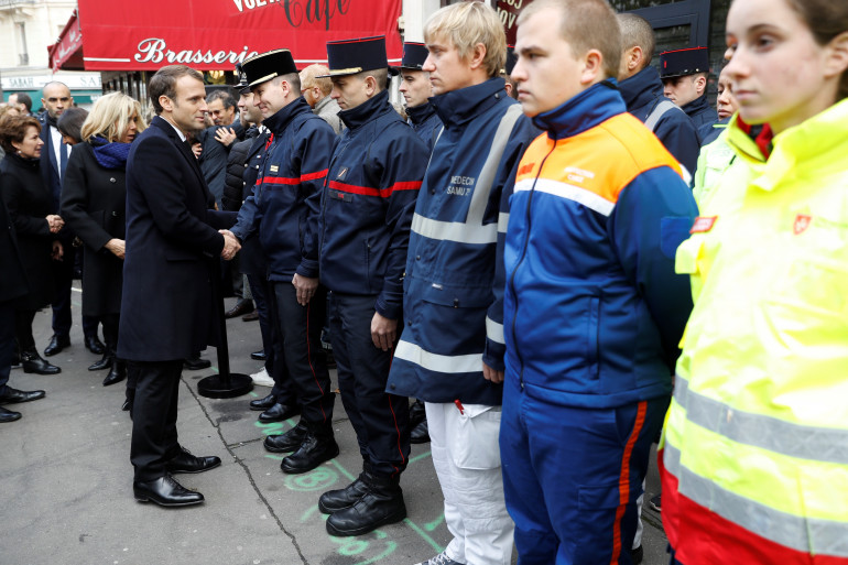 Emmanuel Macron salue les pompiers de Paris au Comptoir Voltaire, lundi 13 novembre 2017.