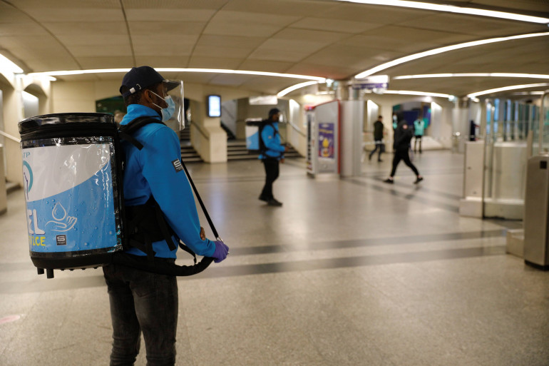 09h36 - Les transports urbains, notamment le métro, sont des lieux particulièrement craints à cause de la concentration de population qui s'y croise. Ce lundi, des agents RATP, un bidon de gel hydroalcoolique sur le dos, en distribuent dans les couloirs.