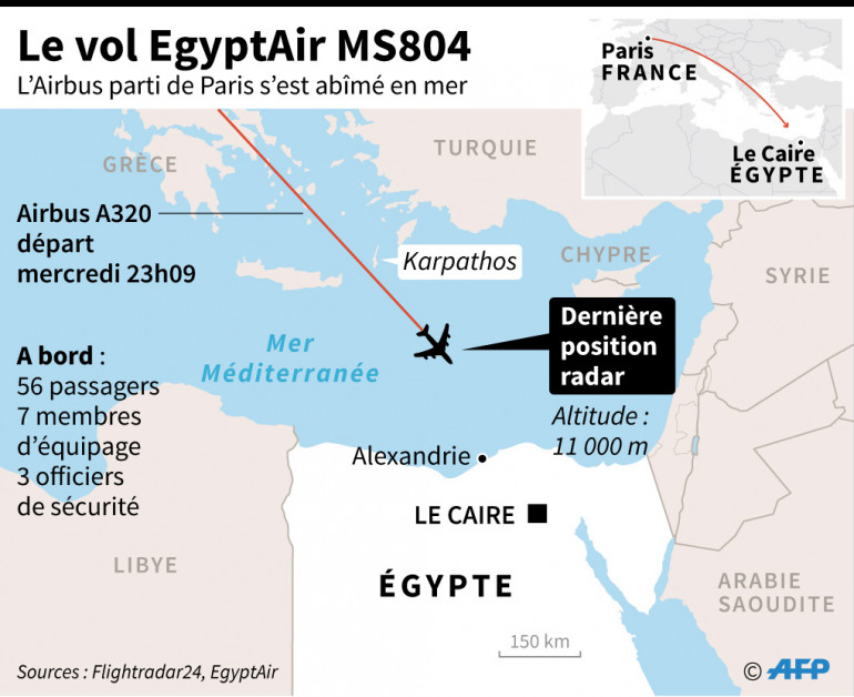 Le vol MS804, parti de l'aéroport Roissy-Charles-de-Gaulle à Paris à 23h09 le 18 mai en direction du Caire a disparu des radars dans la nuit de mercredi à jeudi selon le compte Twitter de la compagnie aérienne Egyptair. L'Airbus A320, qui transportait 66 passagers au total, 53 adultes, 2 nourrissons, 1 enfant et 7 membres d'équipage et 3 officiers de sécurité à bord, devait arriver au Caire vers 3h15 du matin.