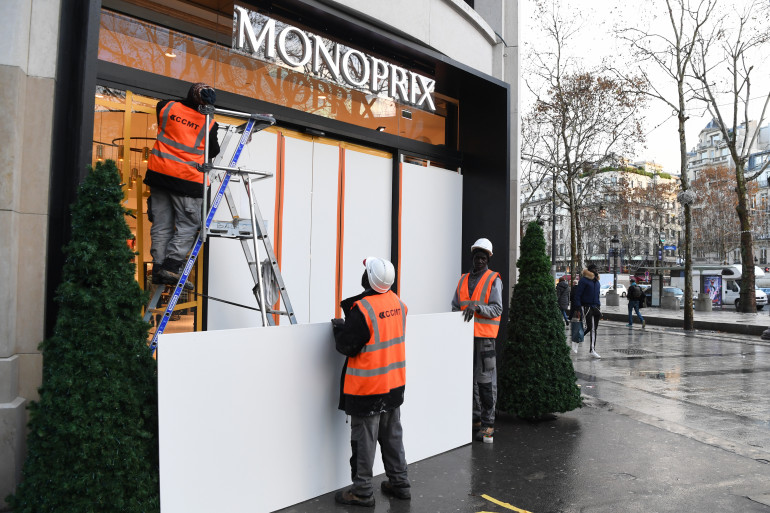 l'avenue des Champs-Élysées, les magasins ont protégé leurs vitrines par précaution.