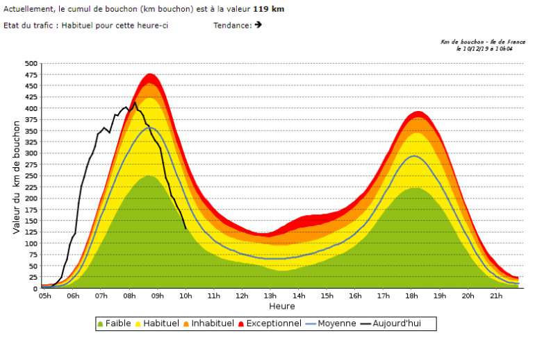 Courbe des bouchons cumulés en Île-de-France à 10h15 ce mardi 10 décembre 2019