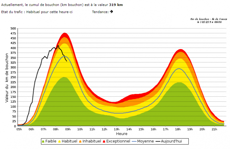 Courbe des bouchons cumulés en Île-de-France à 9h ce mardi 10 décembre 2019