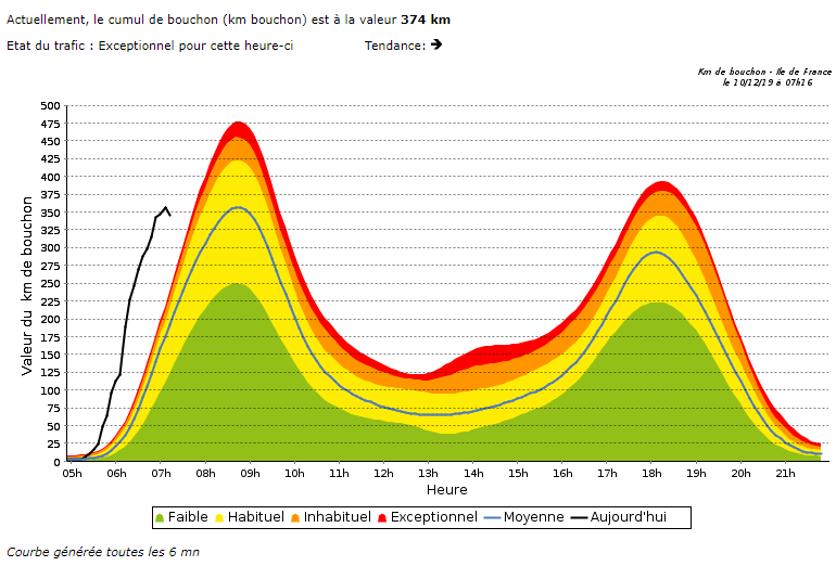 7h35 - 374 km de bouchons cumulés en région parisienne actuellement contre 150 en moyenne habituellement. Du monde aussi aux entrées de Lyon, Toulouse, Marseille et Grenoble.