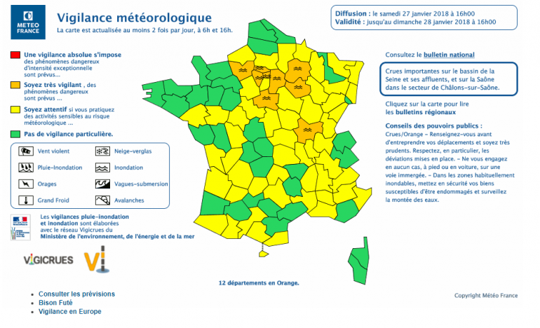 11h20 - Treize départements sont en vigilance orange "inondation" ce samedi 27 janvier en milieu de matinée. Les départements concernés par la crue sont Paris, les Hauts-de-Seine, la Seine-Saint-Denis, le Val-de-Marne, les Yvelines, le Val-d'Oise, la Seine-et-Marne, l'Eure, le Loiret, la Marne, l'Aube, la Saône-et-Loire et le Jura.