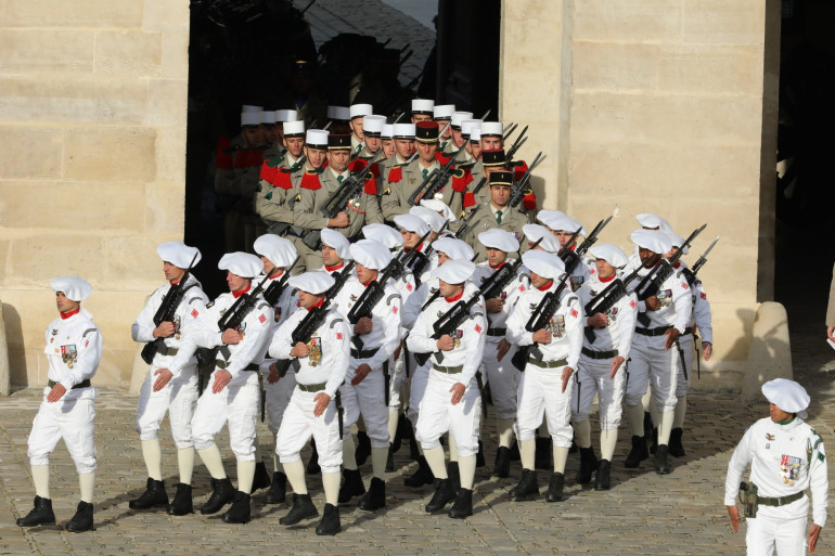Les chasseurs alpins et les légionnaires font leur entrée dans la cour des Invalides le 2 décembre 2019
