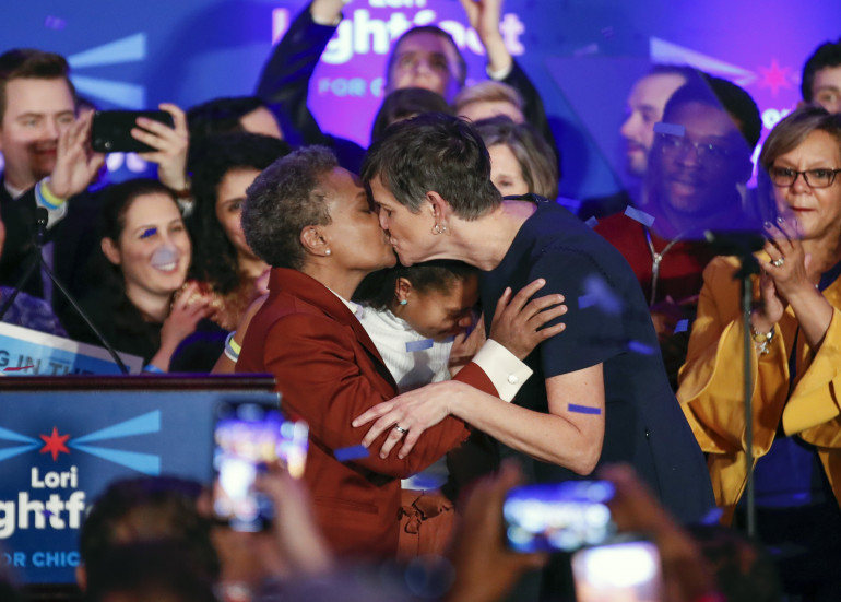 Lori Lightfoot, ouvertement lesbienne, embrasse son épouse Amy Eshleman le soir de son élection, le 2 avril 2019 à Chicago
