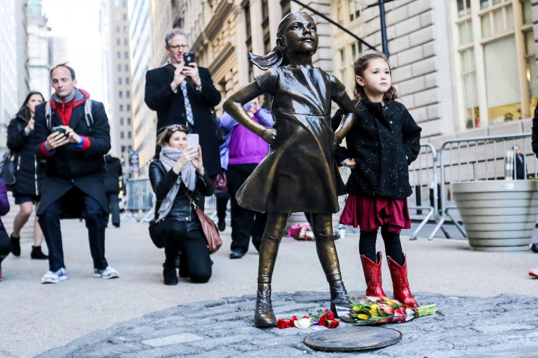 La présence de Fearless Girl devant le Charging Bull - symbole de la "force et du pouvoir du peuple américain", placée en décembre 1989 par le sculpteur italo-américain Arturo Di Modica - n'a rien du hasard. La fillette a été installée là le 7 mars dernier par le gestionnaire d'actifs State Street Global Advisors. Le groupe financier marquait ainsi le lancement d'une campagne pour inciter les sociétés, dans lesquelles il investit, à augmenter le nombre de femmes dans leurs conseils d'administration.
