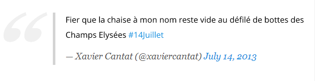 Une fois n'est pas coutume, c'est en coulisses qu'un événement va venir perturber le déroulement des cérémonies du 14 juillet 2013. Xavier Cantat, le compagnon de la ministre Cécile Duflot, publie un tweet anti-fête nationale.