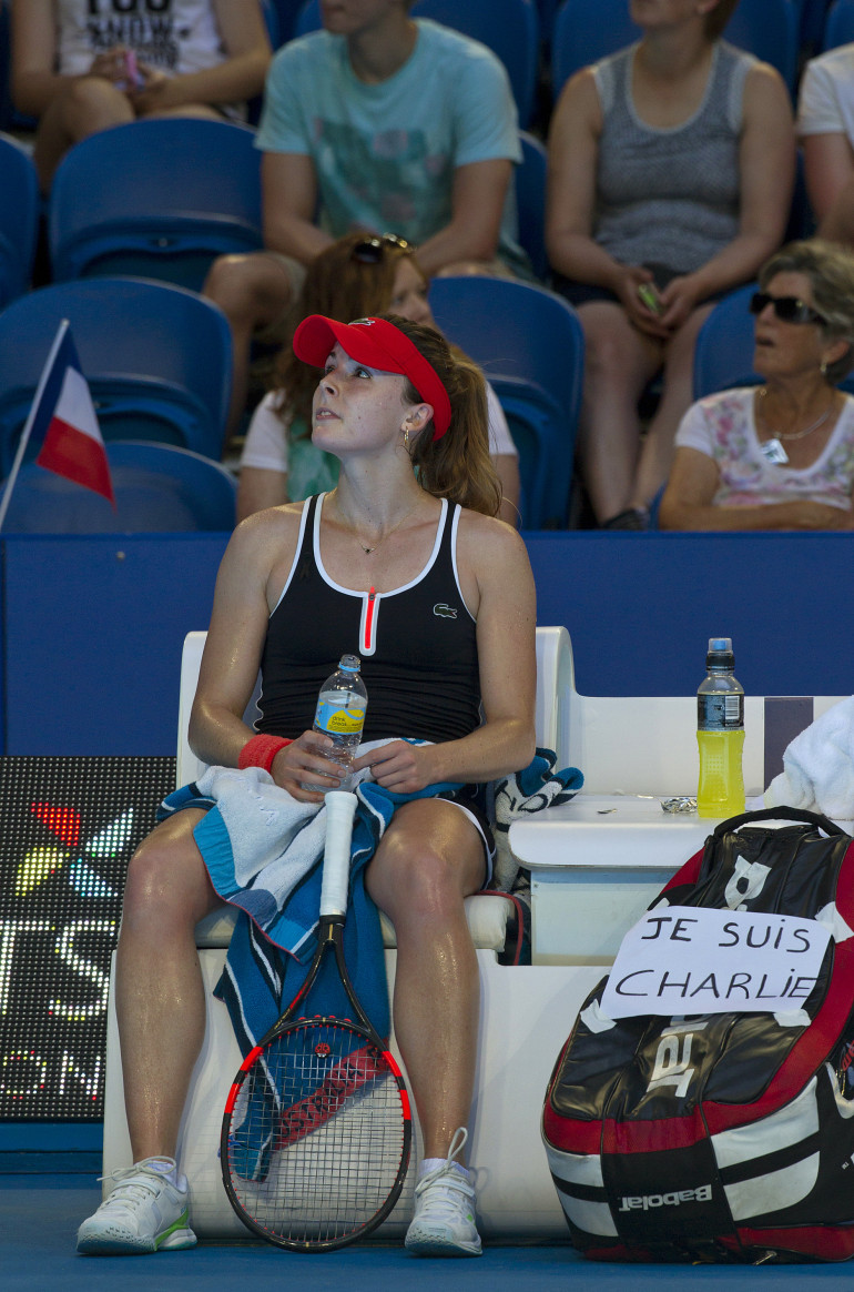 Actuellement à Perth avec Benoît Paire pour représenter la France lors de la la Hopman Cup, compétition par équipe mixte, Alizé Cornet a scotché une feuille de papier sur son sac de tennis. La numéro 1 française, 18e joueuse mondiale, exprime son soutien à Charlie Hebdo depuis les premières heures qui ont suivi le drame.