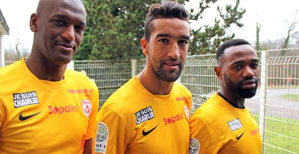Dijon, qui reçoit Tours, a choisi d'afficher son soutien à Charlie Hebdo avec le message inscrit en blanc à l'arrière de son short rouge.
