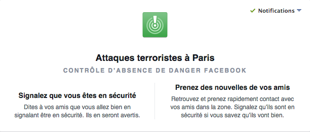 Facebook a lui déclenché son bouton d'urgence : "Il semble que vous soyez dans la région touchée par les attaques terroristes à Paris. Dites à vos amis que vous êtes en sécurité". Chaque personne se voit offrir le moyen de rassurer ses contacts et ses proches via le réseau social en cliquant sur "en sécurité". Les inscrits sur Facebook reçoivent de leur côté une notification les rassurant sur la situation de leurs proches présents dans les environs des attaques, grâce au service de géolocalisation.