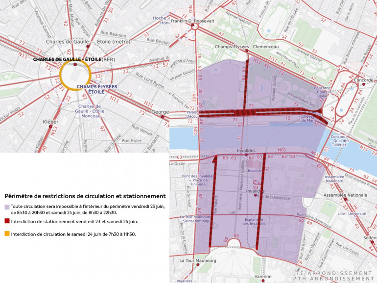 La Mairie de Paris précise que les stations de métro situées sur le parcours de la manifestation risquent d'être fermées. Toutefois, les correspondances restent assurées. À noter qu'en raison de travaux le samedi 24 juin, aucun train du RER C ne circule entre les gares d'Invalides et de Versailles Château et St Quentin en Yvelines.