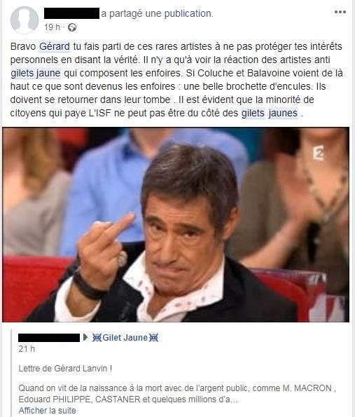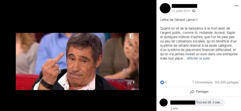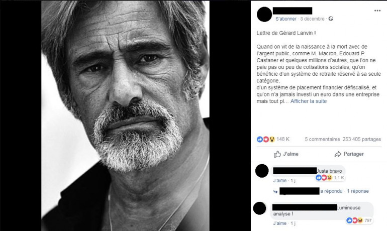 La fausse lettre attribuée à Gérard Lanvin a ensuite été largement partagée sur Facebook.