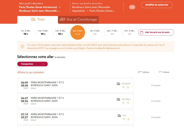 Alors que les syndicats représentatifs de la SNCF ont lancé un préavis de grève pour le 5 décembre contre la réforme des retraites, la compagnie ferroviaire a pris ses dispositions en bloquant l'ensemble des réservations TGV et de certains Intercités pour la journée. Sur certaines lignes, il est même impossible de prendre un billet jusqu'au 9 décembre inclus.