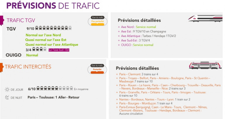 Du côté des TGV, le trafic est presque normal ave 9 trains sur 10 assurés. Si tous les axes reviennent à un trafic normal, c'est du côté de l'axe Sud-Est que la situation est plus délicate avec 3 TGV sur 4 au départ. Le trafic Ouigo est, quant à lui, normal.