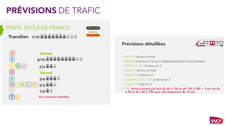 Sur le réseau Transilien, 7 trains sur 10 circuleront. Dans le détail, le trafic sur les lignes A et U est normal, en revanche sur la B, seuls 8 trains sur 10 partent, 2 sur 3 sur les lignes C, D et E. Comptez 3 trains sur 4 sur la ligne N, 2 sur 3 pour les lignes H, J, K, L, et P et enfin 1 sur 2 sur la R.