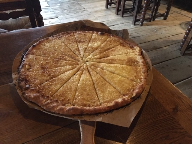Un merveille de galette au sucre, créée en 1912 par Marie-Louise Thibaud à l'hostellerie du vieux Pérouges, où Eric, cuisinier, perpétue la tradition séculaire.