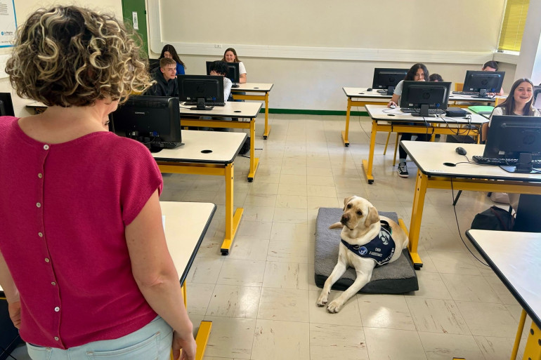 Le chien d'assistance, Urda, dans une salle de classe du lycée Raymond Cortat à Aurillac.