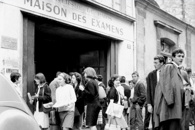 Un groupe de lycéens devant un centre d'examen du baccalauréat