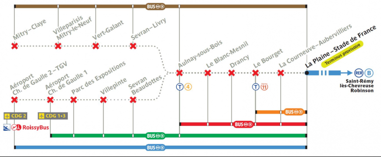Pour se rendre à la Courneuve-Aubervilliers, à l'Aéroport Charles-de-Gaulle 2, à Mitry-Claye ou aux arrêts situés entre ces stations du RER B, cinq services de bus sont mis en place dans les deux sens (voir illustration ci-dessous) au départ de la Plaine-Saint-Denis et de Charles-de-Gaulle 2.