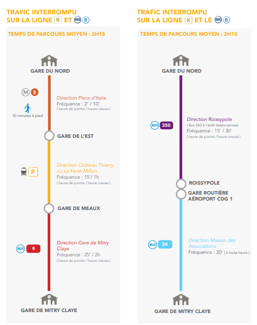 Pour les usagers empruntant le RER B jusque Mitry-Claye, la ligne K du transilien ne saurait être une alternative : celle-ci sera également fermée pour travaux en direction du nord. Pour se rendre à Mitry-Claye, la SNCF recommande d'emprunter deux itinéraires bis depuis la Gare du Nord à Paris (voir illustration ci-dessous).