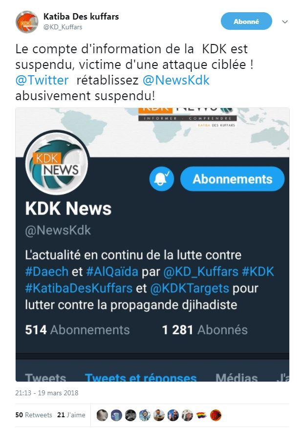 Et depuis quelques semaines, ils voient leurs comptes sauter les uns après les autres. Lundi 19 mars, c'est un compte rattaché à la Katiba des kuffars qui s'est vu supprimer après des signalements en masse.