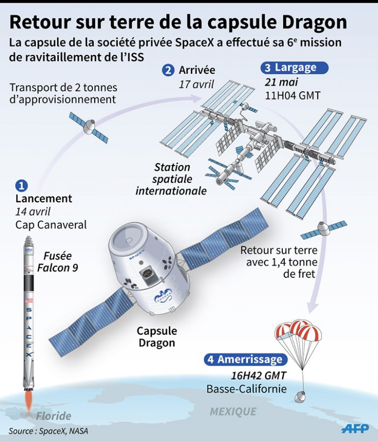 Une fois posée dans l'océan, un navire est chargé de ramener la capsule sur la terre ferme. Vendredi 22 mai, cette opération s'est déroulée sans encombres. Dragon a amerri au large des côtes mexicaines avec à son bord 1,4 tonne de frets. Si les conditions météorologiques le permettent, l'engin retrouvera l’immensité de l'espace le 26 juin prochain pour une 7e mission de ravitaillement de l'ISS.