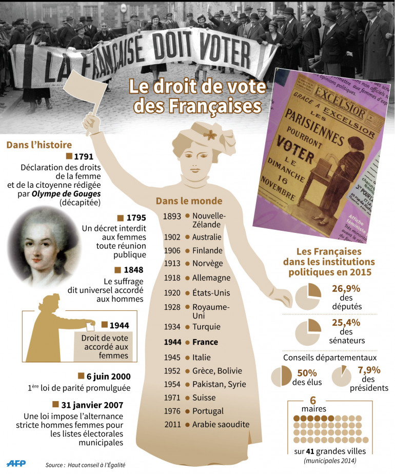Et dès ce premier scrutin, la France connaît ses premières élues. Le plus souvent issues du parti communiste et de la Résistance, elles prennent leurs quartiers dans des mairies de la région parisienne, de Vendée... Néanmoins, si les Françaises ont acquis le droit de vote et d'éligibilité comme les hommes, leur représentation dans la vie politique actuelle est encore loin d'être égalitaire. En effet, à l'heure actuelle, seul un quart des députés et sénateurs de la République sont des femmes.