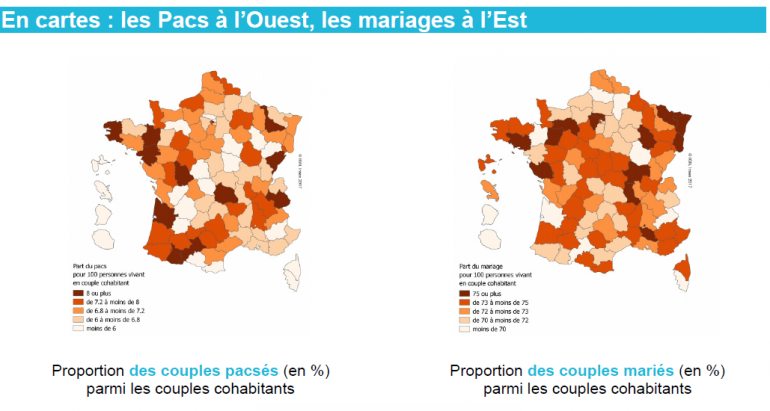 À y voir de plus près, on s’aperçoit que d'un département à l'autre, les formes d'union sont différentes. Ainsi, le Pacs est peu développé dans les territoires d’Outre-Mer (2 à 3% des couples vivant en Martinique, en Guadeloupe ou à la Réunion), alors qu’il est plus répandu dans les départements de l'ouest, tels que la Loire-Atlantique (9%), Haute-Garonne et en Ille-et-Vilaine (10%). À Clermont-Ferrand, Rennes, Nantes, Toulouse, Bordeaux, Lille et Lyon, 10% ou plus des couples sont pacsés et un quart sont en union libre (26 %).