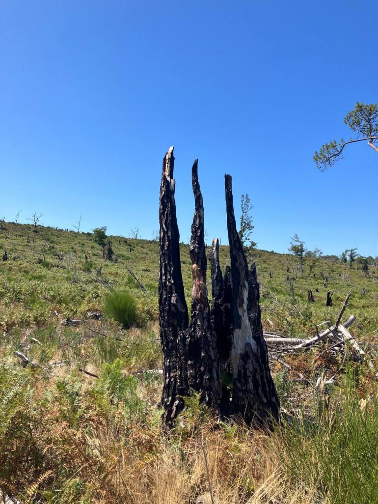 À l'endroit où s'est déclaré l'incendie, causé par le feu d'une camionnette, c'est impressionnant. L'avant/après est saisissant. Avant, on ne voyait pas la Dune du Pilat d'ici, alors qu'aujourd'hui, on la voit bien. "Si on tourne à 360°C autour de nous, on a un paysage assez lunaire. Il y a encore des souches calcinées, quelques pins qui tiennent encore debout, mais pour le reste, tout a été rasé, tout a été calciné. Il n'y a plus rien", déplorent Antoine et Claude, deux propriétaires de parcelles.