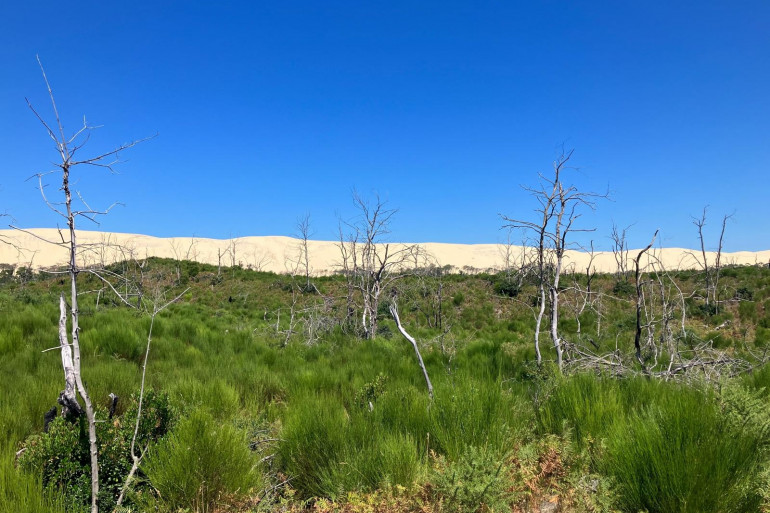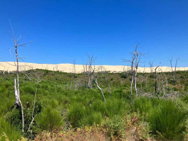 Dans ce nouveau paysage, on voit surtout du sable et un peu de plantes vertes. Il y a des genêts, des fougères, mais pas de pin. "On va peut-être trouver quelques arbres, mais ça doit concerner même pas 1% de la forêt en réalité."