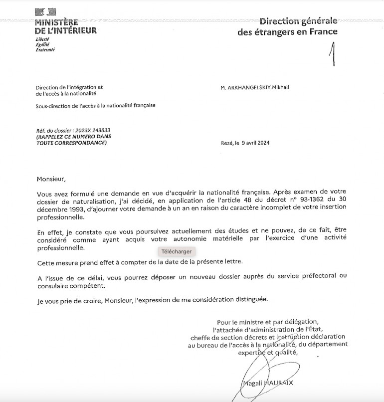Le nageur a été notifié le 9 avril que sa demande de naturalisation a été ajourné d'un an par le ministère de l'Intérieur "en raison du caractère incomplet de son insertion professionnelle". "Je constate que vous poursuivez actuellement des études et ne pouvez, de ce fait, être considéré comme ayant acquis votre autonomie matérielle par l'exercice d'une activité professionnelle", écrit le ministère. "Je ne travaille pas et ils n'ont pas pris en compte le fait que je sois sportif de haut niveau. J'ai été le premier choqué et déçu", réagit Michel Arkhangelsky.