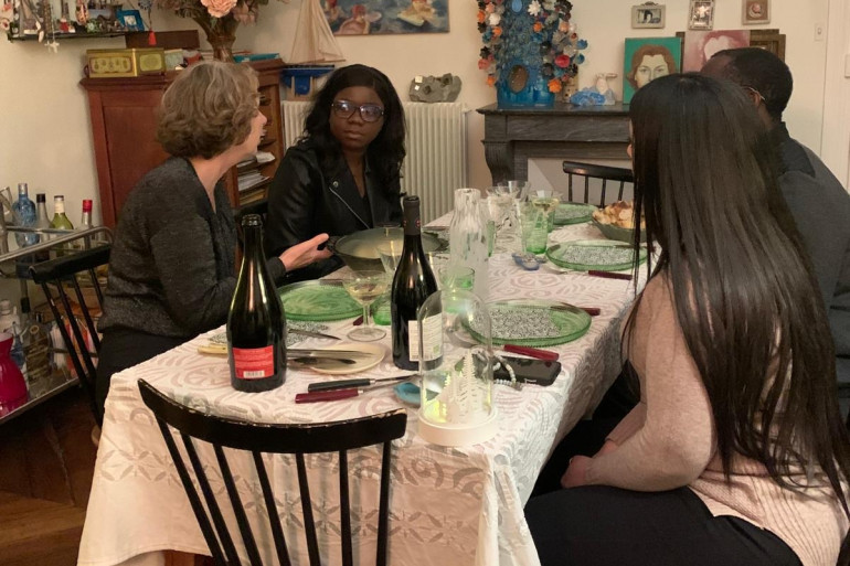 Après quelques minutes, les langues se délient. Ensemble, ils comparent leurs différentes traditions pour les fêtes, parlent football avec la Can, la Coupe d'Afrique des nations qui a lieu en ce moment. Puis vient l'ouverture des cadeaux. Anastasie déballe un roman offert par son hôte Virginie. Émue, elle prend tout de suite son paquet en photo pour l'envoyer à sa famille.