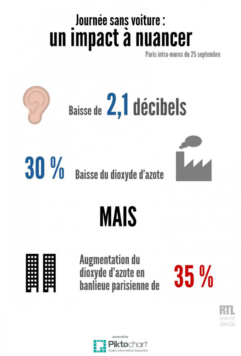 L'association Bruitparif a aussi publié son rapport d'analyse de l'impact acoustique de l'opération "Journée sans voiture". Elle relève une diminution moyenne de 2,1 décibels au sein de la zone centrale. L'association note que ces résultats "peuvent paraître faible à première vue mais semblent cohérents avec les chiffres de baisse de circulation observée".