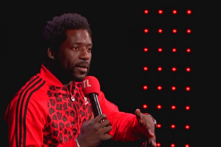 On entend sur la séquence une voix l'insulter à trois reprises de "sale noir", après une réplique sur le fait qu'un spectateur assume son vote pour le Front national (ancien nom du Rassemblement national). L'homme n'a pas pu être identifié mais l'humoriste explique qu'une spectatrice lui a ensuite envoyé la vidéo et qu'il l'a postée à titre d'exemple sur les réseaux sociaux, précisant qu'il ne s'agit pas d'un coup monté avec un complice.