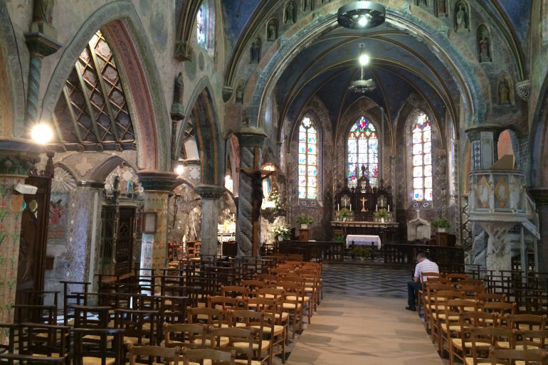 À la manière du facteur à cheval dans la Drôme, l'homme a consacré sa vie à ramasser du marbre, des pierres et autres objets dans tout le Boulonnais pour décorer son église qui est aujourd'hui peinte sur tous les murs.