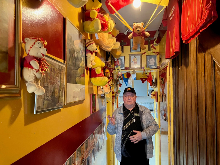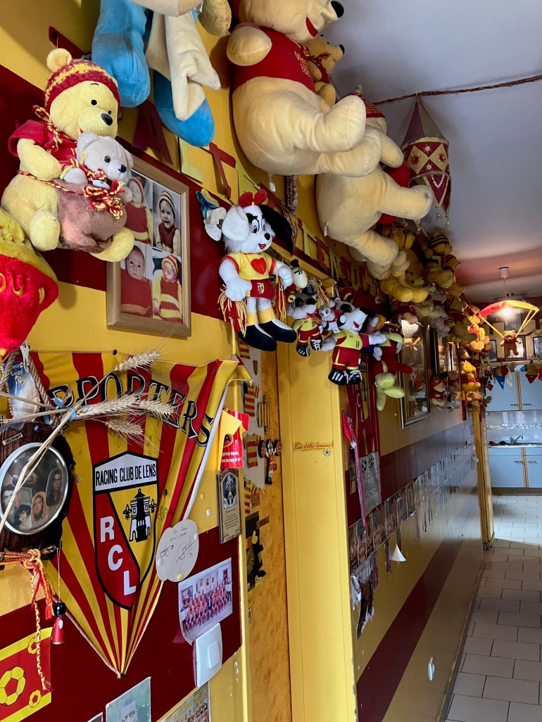 "Pour mémé, ce n'était jamais assez. Il fallait toujours rajouter de nouveaux objets aux couleurs de Lens" témoigne un de ses fils, Antoine. Sur les murs, repeints en jaune et rouge du sol au plafond, les photos de famille côtoient celles des joueurs artésiens, avec des maillots, drapeaux, ours en peluche...