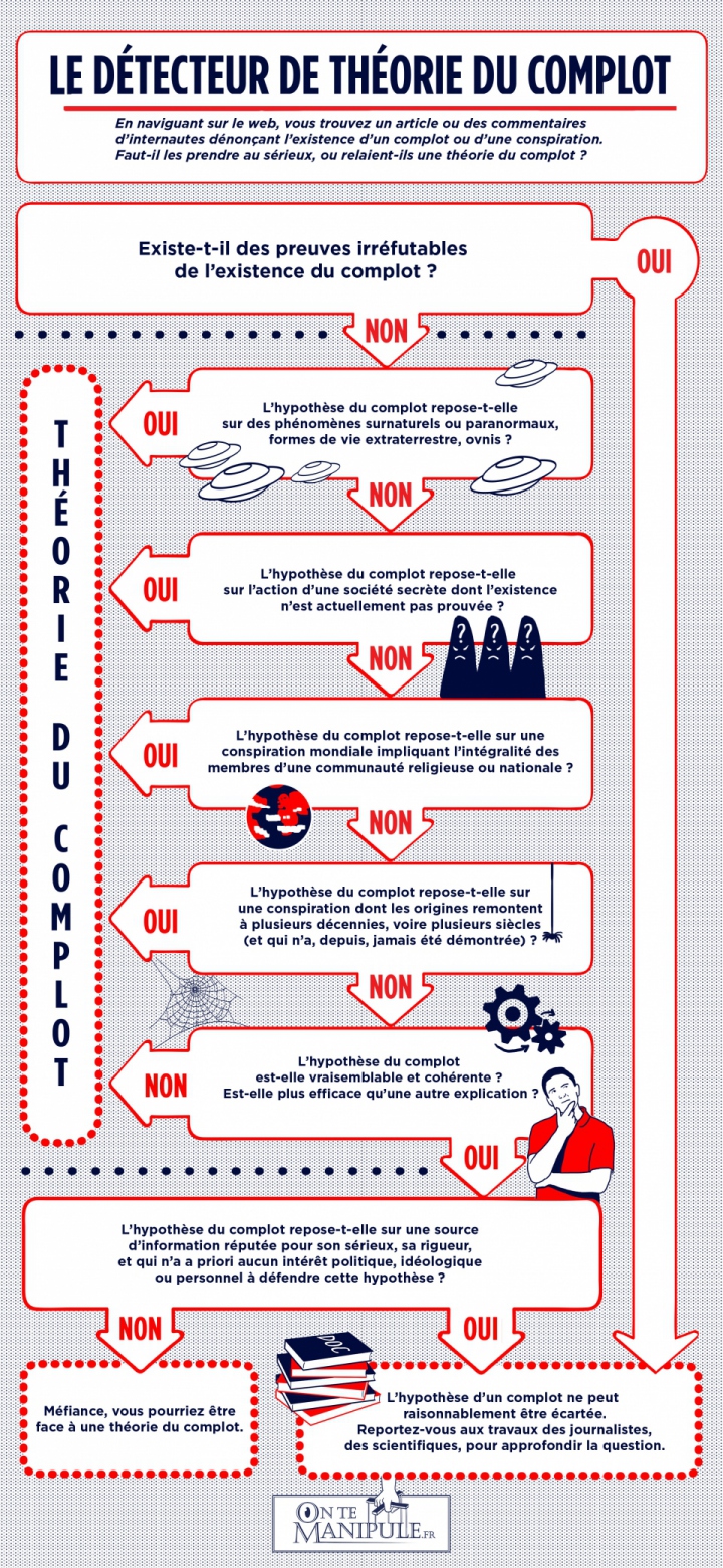 Sur la page d'accueil du site "Ontemanipule.fr", le gouvernement présente les "7 commandements de la théorie du complot" pour donner aux plus jeunes les clés leur permettant de "garder un sens critique et prendre du recul par rapport aux informations qui circulent". Le site affiche également une infographie présentée comme un "détecteur de théorie du complot".