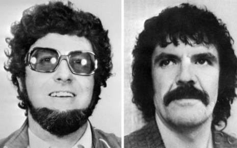 Montage de photos d'archives non datées du malfaiteur Jacques Mesrine (G), un autoportrait avec une fausse barbe, et de son complice Charlie Bauer (D)