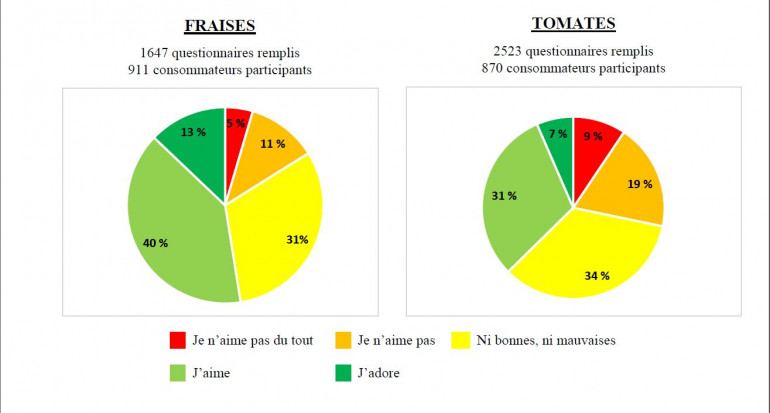 Il s'agissait de goûter 2 fraises et 3 tomates, de catégories et prix différents. Les tomates testées étaient toutes de production française, alors qu'un tiers des fraises venaient de l'étranger, majoritairement d'Espagne. Si les produits les plus chers semblent être très légèrement plus appréciés, il ne s'agit pas d'un emballement de la part des consommateurs. Ainsi, seuls 38% d'entre eux sont satisfaits du goût des tomates en général. Les testeurs sont donc déçus en majorité. Pire, les différentes catégories proposées en rayon (rondes, en grappes, côtelées) ne semblent avoir aucune pertinence en terme de goût.