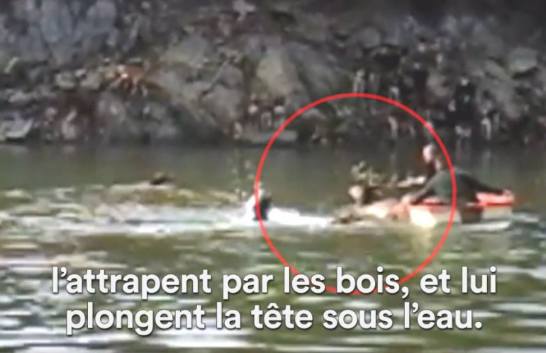 Alors qu'elle tente d'échapper à la meute de chiens en passant par un point d'eau, deux chasseurs en barque s'approchent de l'animal et lui maintiennent la tête sous l'eau en appuyant sur ses bois. Une fois noyé, l'animal est sorti de l'eau puis dépecé. Selon un sondage Ifop pour la Fondation Brigitte Bardot, 84% des Français se prononcent pour l'interdiction de la chasse à courre, rappelle le média.