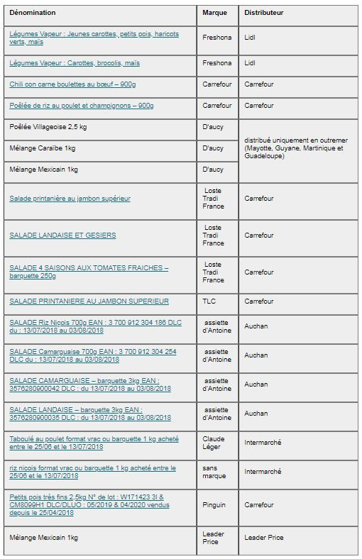 En France, ces produits sont des légumes vapeurs, du chili con carne boulettes au bœuf, des salades landaises gésiers, des salades de riz, du taboulé au poulet, des poêlées, etc. L'entreprise Lidl a d'ores et déjà annoncé le retrait et le rappel de légumes vapeur de la marque Freshona.