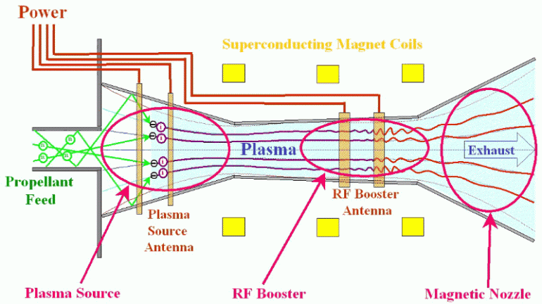 Ce plasma est ensuite maîtrisé grâce à une bobine électromagnétique, il sera alors accéléré fortement avant d'être éjecté, avec la possibilité de contrôler le diamètre d'ouverture de la bobine pour contrôler la puissance de sortie. C'est alors le principe d'action-réaction qui va provoquer la poussée. L'éjection à très haute vitesse fera donc avancer la navette spatiale. Franklin Chang-Diaz a réussi a faire fonctionner un prototype mais uniquement dans une chambre sous vide. Il a désormais 3 ans et 10 millions de dollars pour rendre son idée applicable.