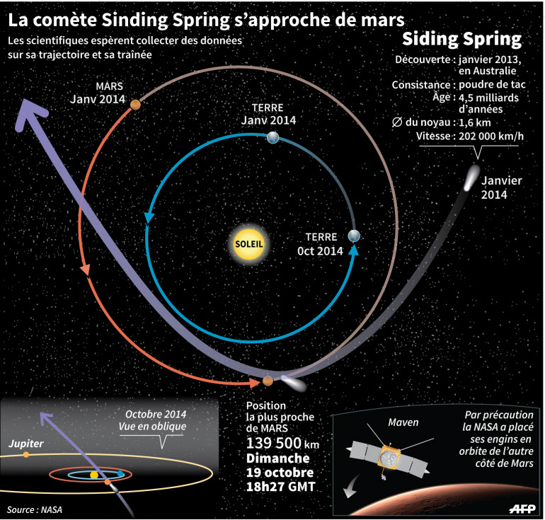 Le noyau de Siding Spring (C/2013 A1) fait environ 1,6 kilomètre de diamètre mais est aussi solide qu'une balle de talc. L'astre, qui file à travers l'espace à 202.000 km/h, a peu de chance d'entrer en collision avec Mars. Mais les scientifiques se délectent par avance de pouvoir étudier sa trajectoire et sa traînée.