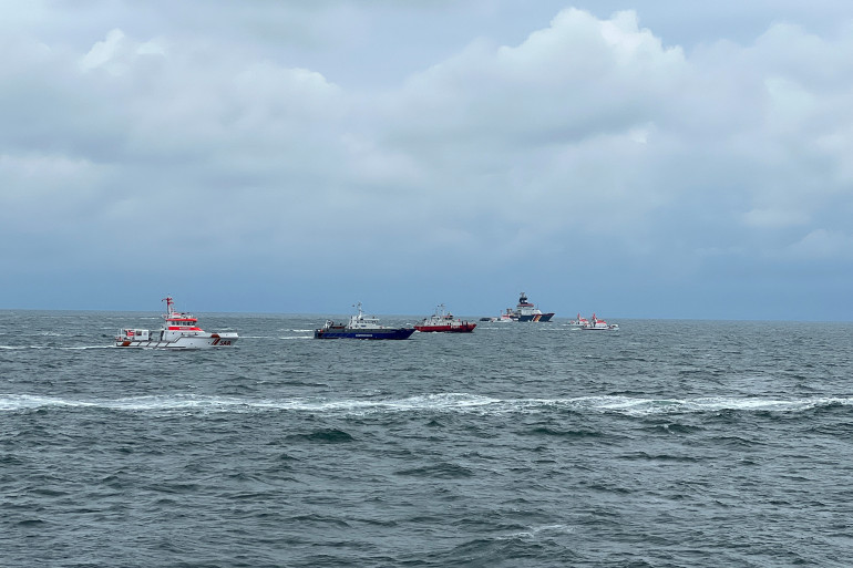Cette photo mise à disposition par le service allemand de recherche et de sauvetage maritime montre plusieurs navires à la recherche de personnes disparues après la collision entre deux cargos, en mer du Nord, le 24 octobre 2023.