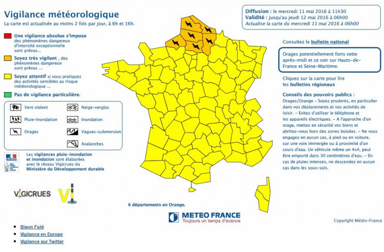 Météo France a placé six départements en vigilance orange aux orages ce mercredi 11 mai.