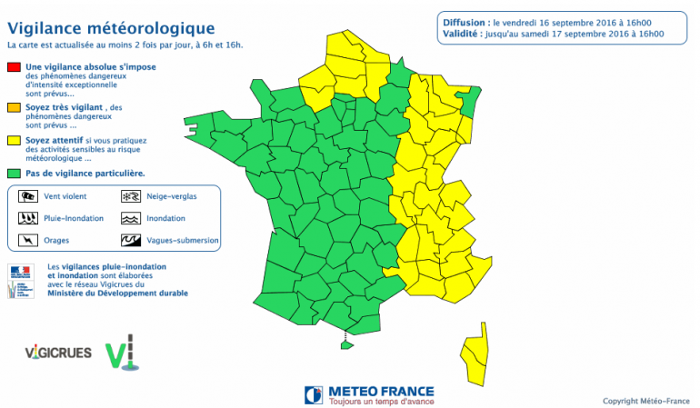 Depuis vendredi 16 septembre à 16 heures, le Gard n'est plus placé par Météo France en alerte orange "orages" et "pluie-inondation". Le département, qui était menacé par des cellules orageuses très localisées, n'est plus qu'en vigilance jaune qui recommande aux habitants d'être simplement attentifs en cas de pratique d'activités "sensibles" au risque météorologique.